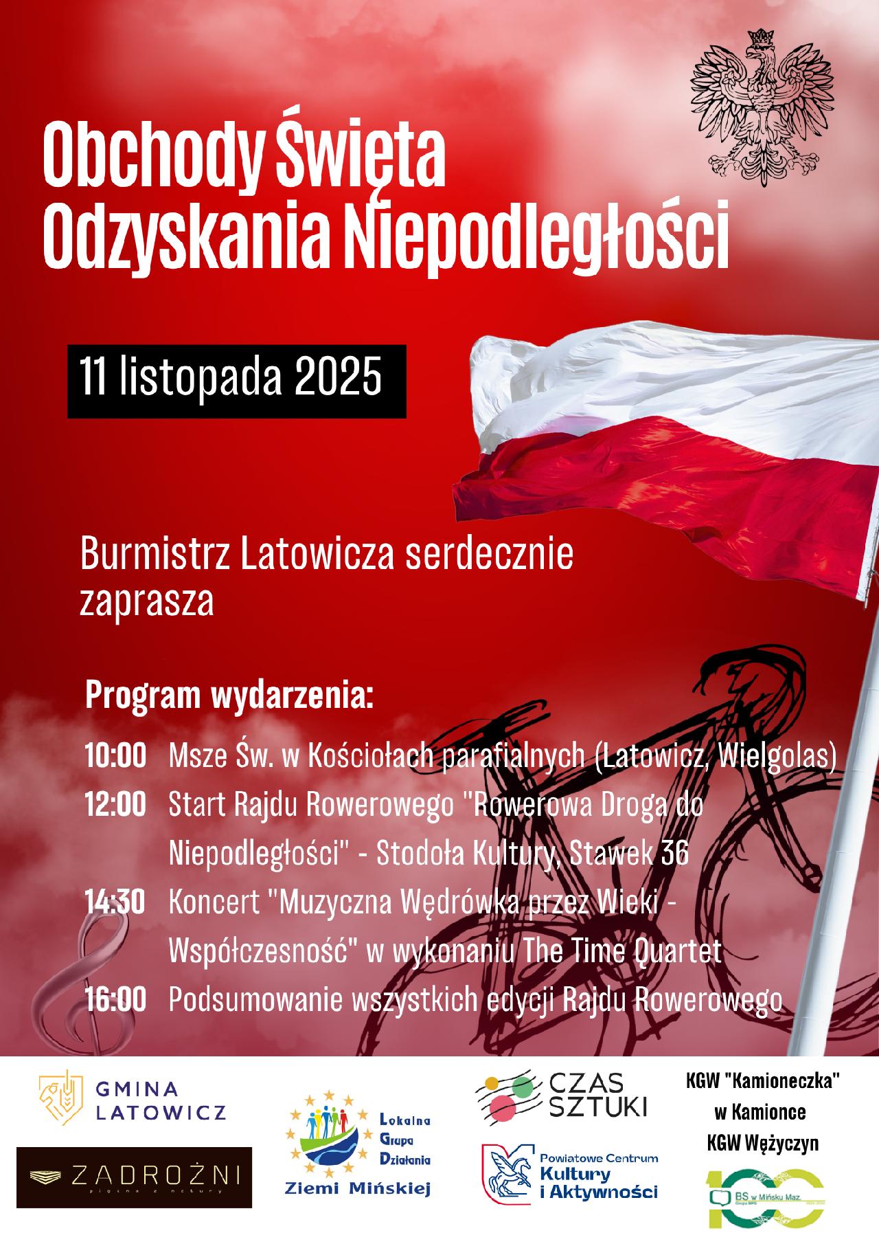 Burmistrz Latowicza serdecznie zaprasza mieszkańców gminy do wspólnego świętowania 11 listopada 2025 roku! To wyjątkowy dzień, w którym razem oddajemy hołd tym, którzy walczyli o wolność naszej Ojczyzny i cieszymy się z niepodległej Polski... Czytaj więcej...