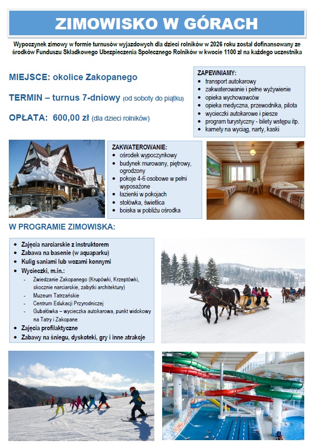 Miejsce: Zakopane i okolice (Poronin - Biały Dunajec) Termin: 17.01.2026 r. - 23.01.2026 r. Opłata dla dzieci rolników 600 zł Opłata dla osób nieubezpieczonych w KRUS-ie 1700 zł... czytaj więcej...